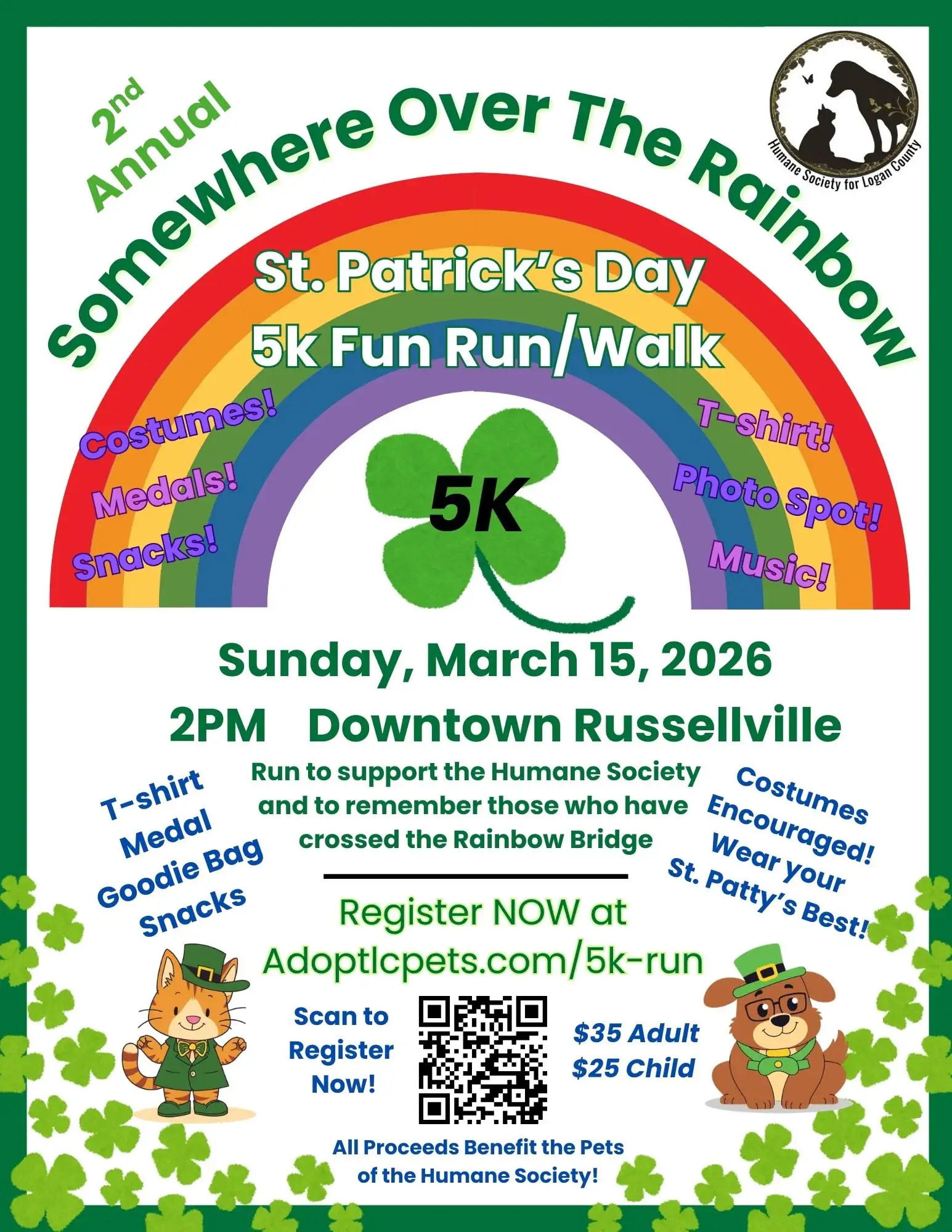 Join us on March 15 in downtown Russellville, KY, for our 2nd Annual Somewhere Over the Rainbow St. Patrick’s Day 5K Fun Run/Walk, benefiting the Humane Society for Logan County!